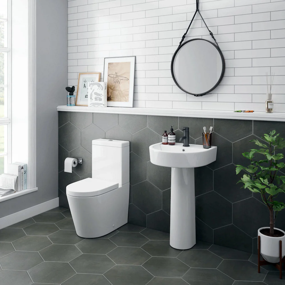 The Arezzo Close Coupled Rimless Toilet is perfect for creating a smart finish in smaller spaces. Its round pan projects just 640mm from the wall, and its modern back-to-wall design keeps pipework neatly hidden. The sleek rimless pan is easy to clean, and the soft close mechanism prevents slamming. This compact toilet also features a dual-flush cistern to help reduce water consumption.