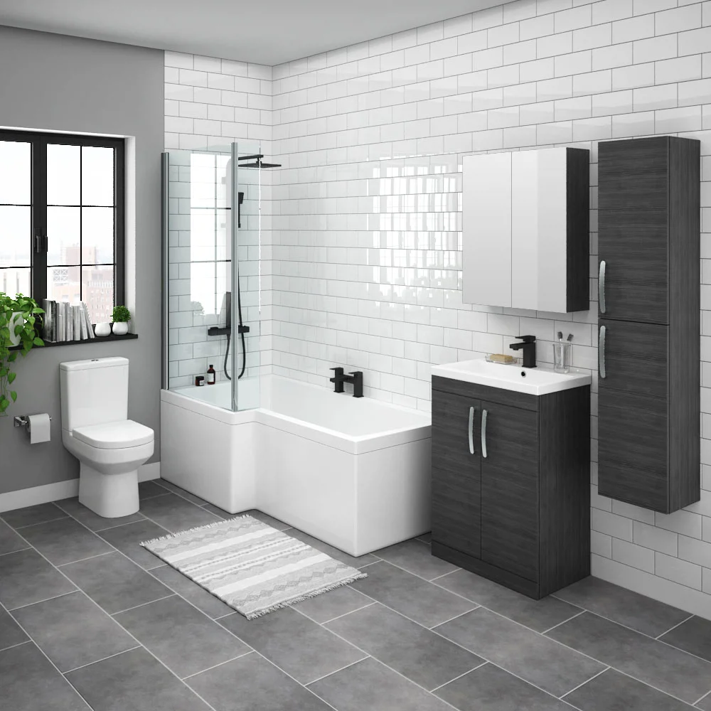 Upgrade your bathroom with the Brooklyn Black L-Shaped Bath Suite, a stylish and practical collection designed for modern living. This suite includes a black vanity unit with a tall, wall-hung cabinet, offering a sleek, contemporary aesthetic.