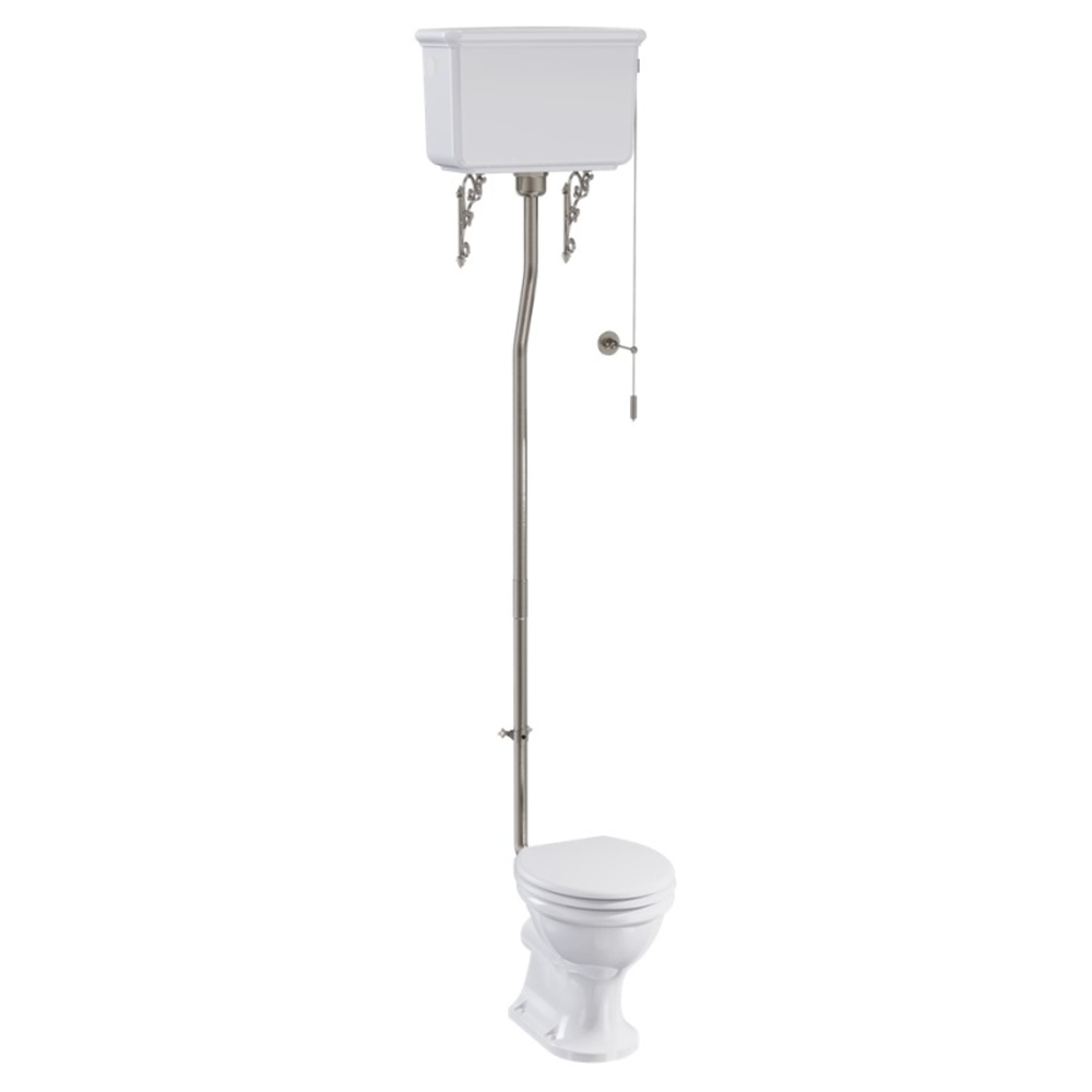 The Burlington Guild High Level Toilet combines traditional design with modern functionality, featuring a sleek, rimless pan with curved shapes and rolling ridges for effective cleaning. The high-level cistern, mounted approximately 2 meters up the wall, includes a dual flush mechanism offering 4L and 6L options, controlled by a pull chain handle. The cistern is connected to the pan via a long flush pipe, and the toilet is finished in gloss white vitreous china. This elegant toilet includes decorative ornamental brackets and is available with various colored soft-close toilet seats (sold separately) to complete the look.