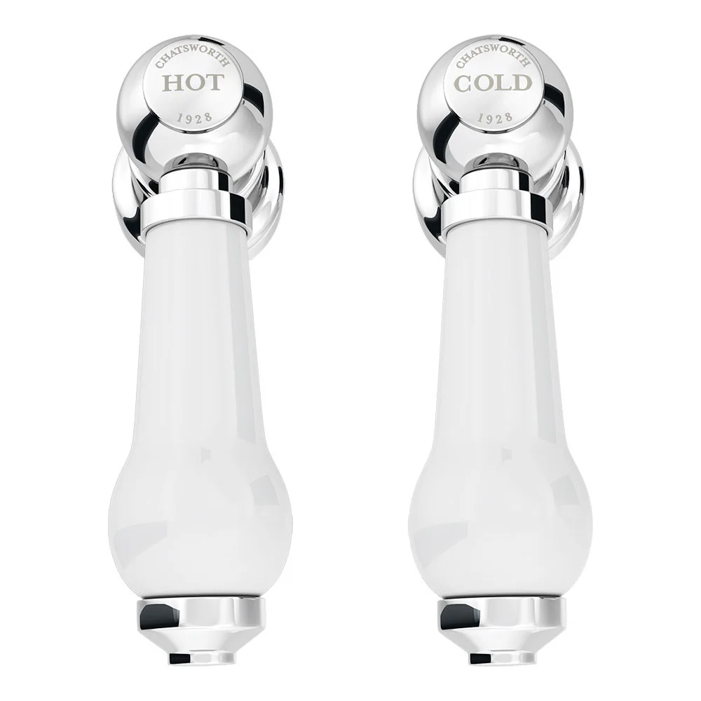 The traditional Chatsworth 1928 chrome three hole deck mounted basin tap with classically styled spout, create a traditional feel in your bathroom with this luxury basin mixer tap. Manufactured from brass with a polished chrome plated finish. Features decorative white lever handles with classic chrome indices to indicate the hot and cold controls. Transform any bathroom’s decor to the luxury and elegance of yesteryear.Â