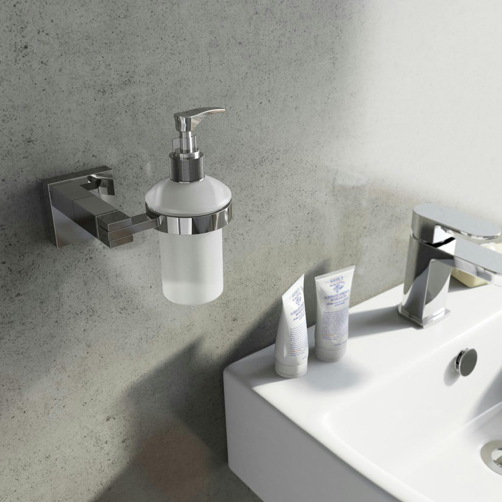- Includes: Toilet Roll Holder, Towel Ring, and Frosted Glass Soap Dispenser