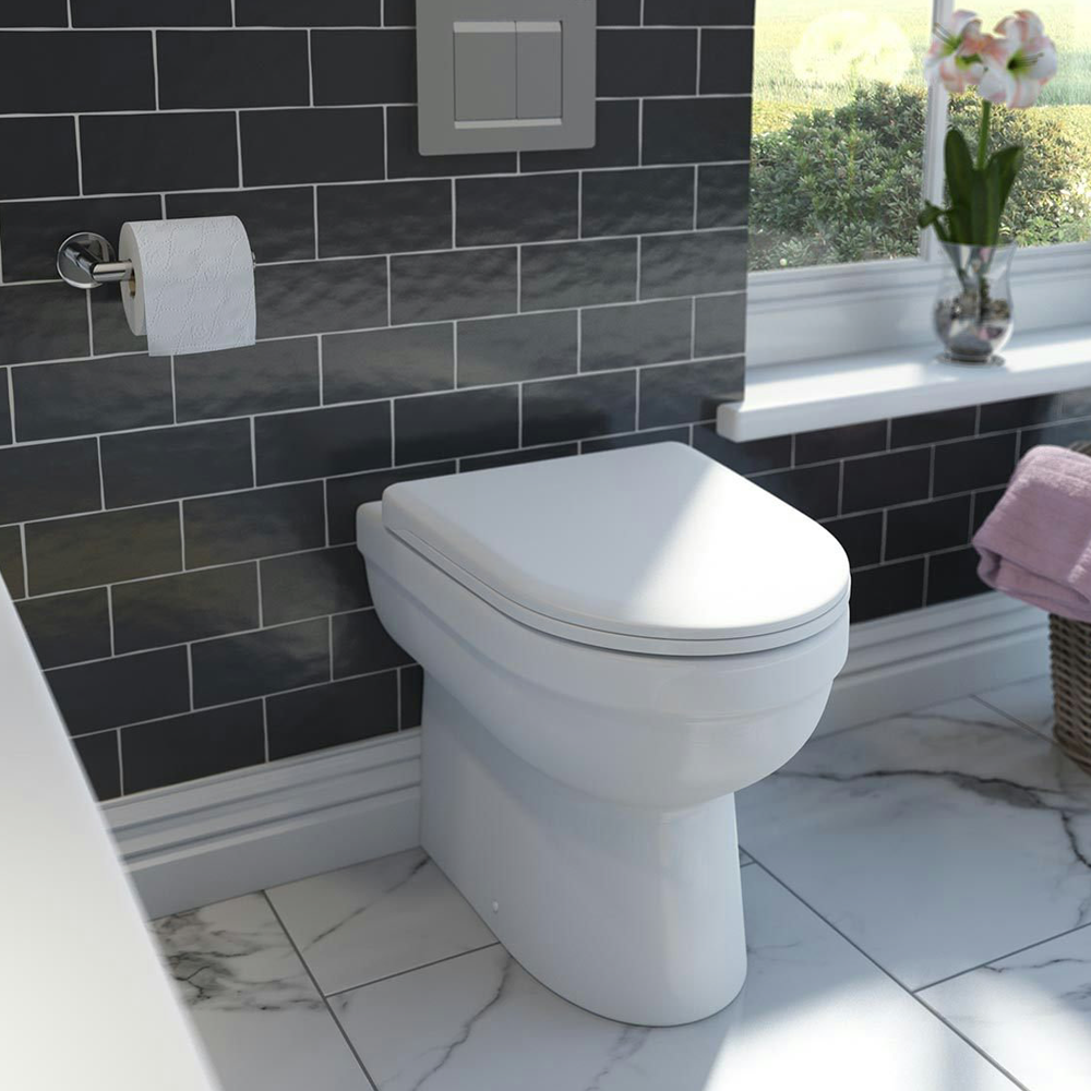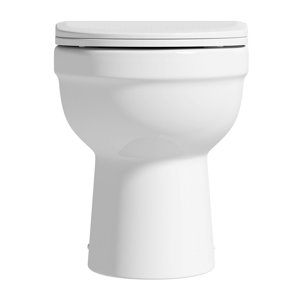 The back-to-wall toilet unit features a high-gloss white finish and is designed for easy installation with KEKU fittings. The accompanying back-to-wall toilet, from the Eden II range, is made from high-quality ceramic with a gloss white finish, complete with a soft-close top-fixing quick-release seat.
