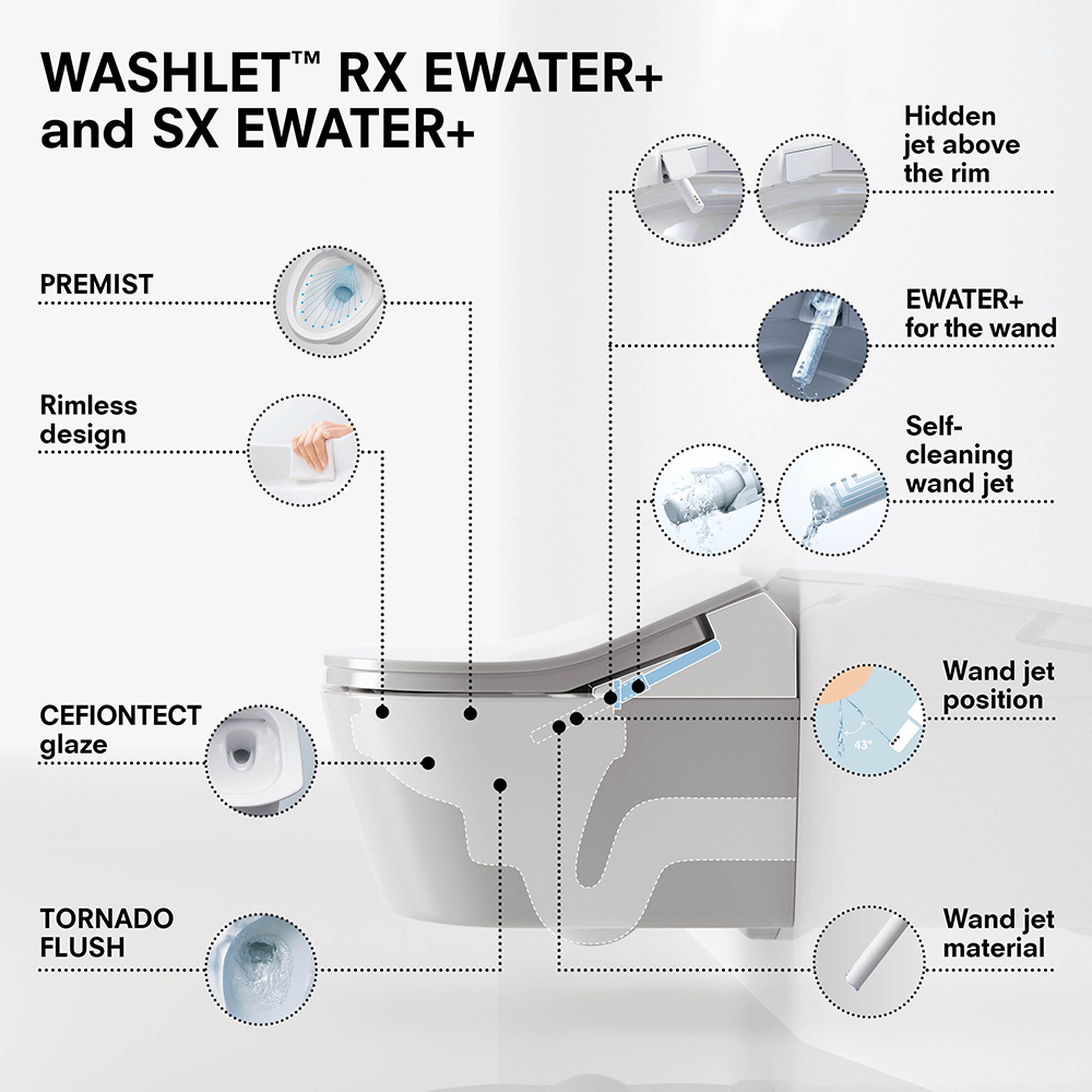 A key innovation is the integrated EWATER+ system, which automatically cleans the wand jet after each use with environmentally friendly electrolysed water that reverts to tap water. Users can also manually activate EWATER+ via the remote. The WASHLET® RX further simplifies maintenance with both automatic and manual descaling options. Additionally, an energy-saving mode and a soft-closing seat contribute to its efficiency and user-friendliness.