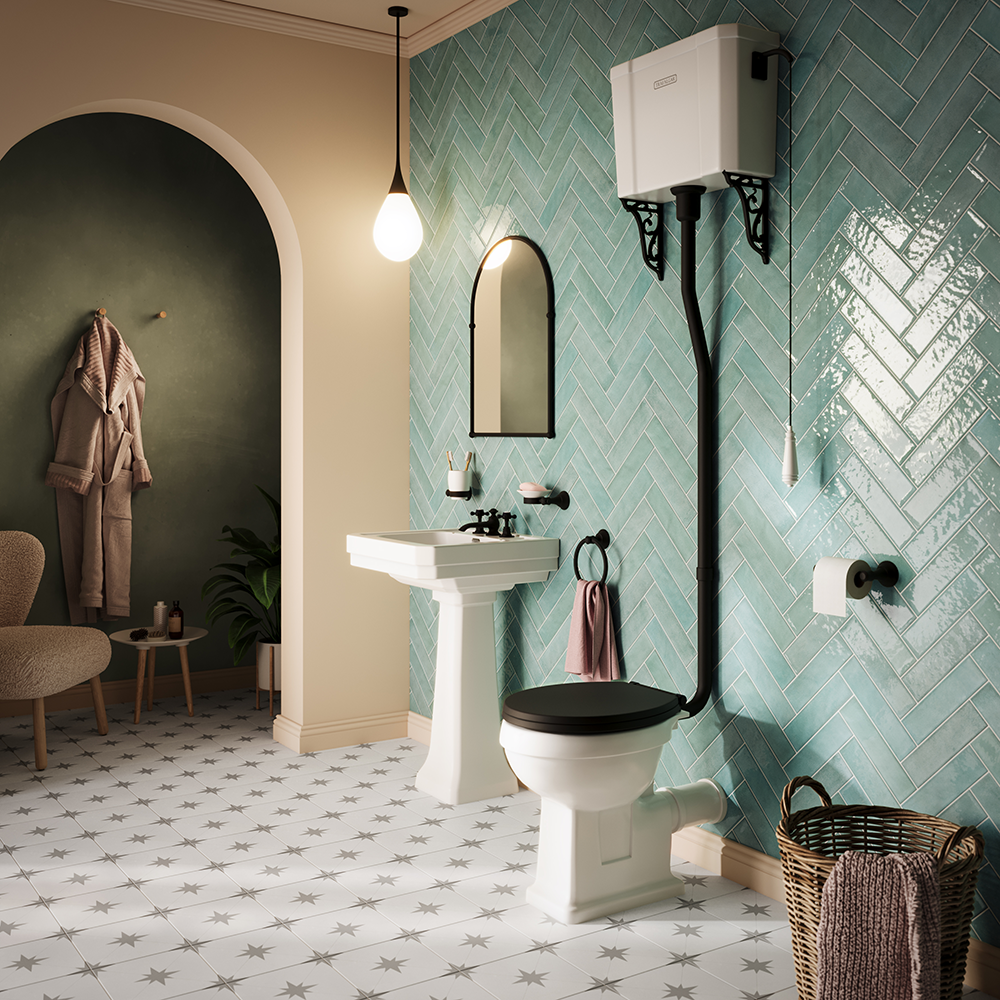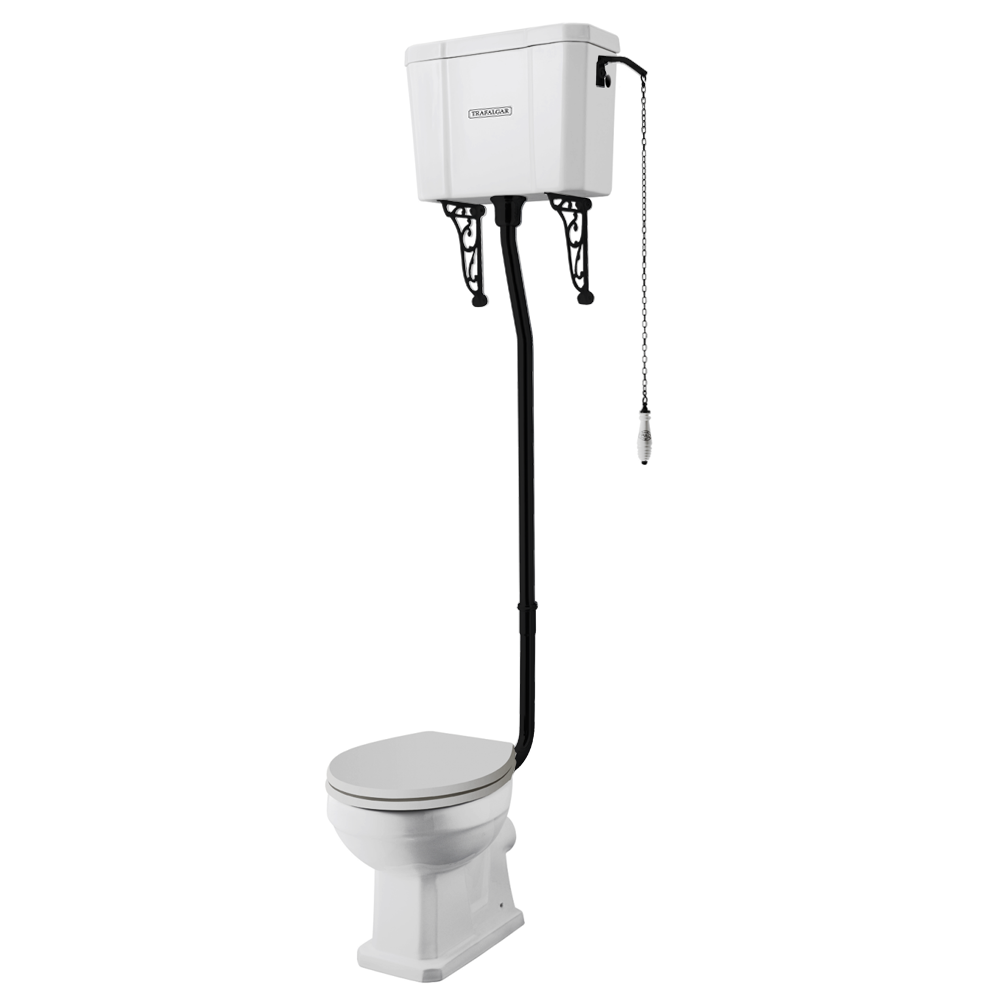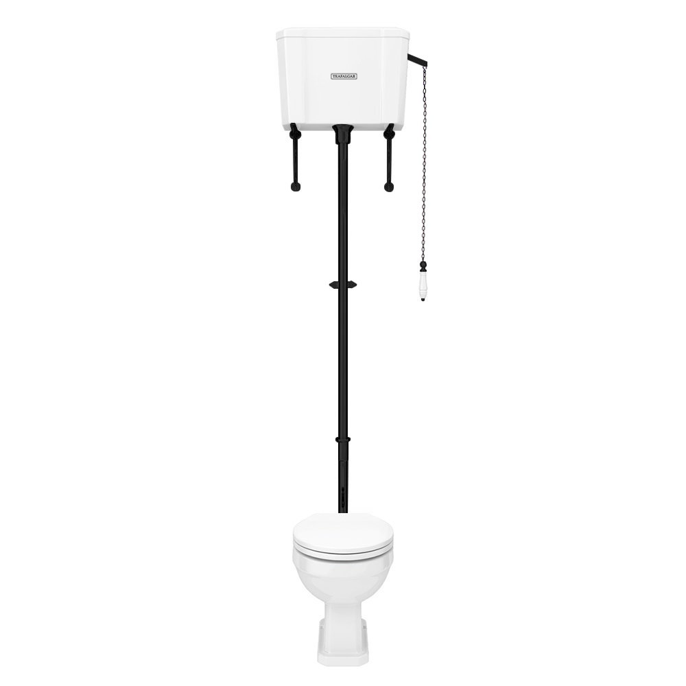 Enhance your bathroom with the Trafalgar Traditional High Level Toilet. This timeless design features a high-level cistern paired with a matt black flush pipe kit, providing an elegant and sophisticated touch to any traditional bathroom setting. The durable ceramic construction ensures longevity, while the high-level design offers a unique and classic aesthetic. Please note that the toilet seat is not included.