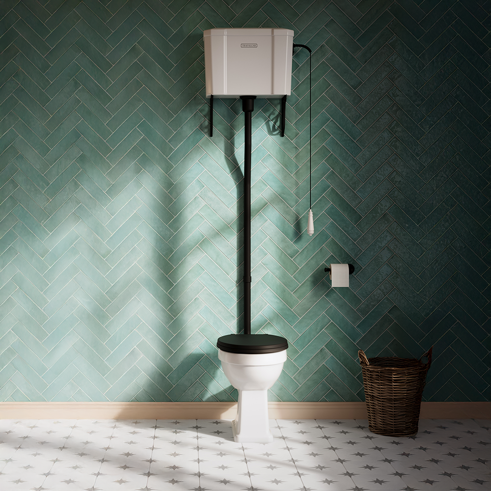 Trafalgar Traditional High Level Pan, Bevelled Style Cistern & Matt Black Flush Pipe Kit – Excludes Seat