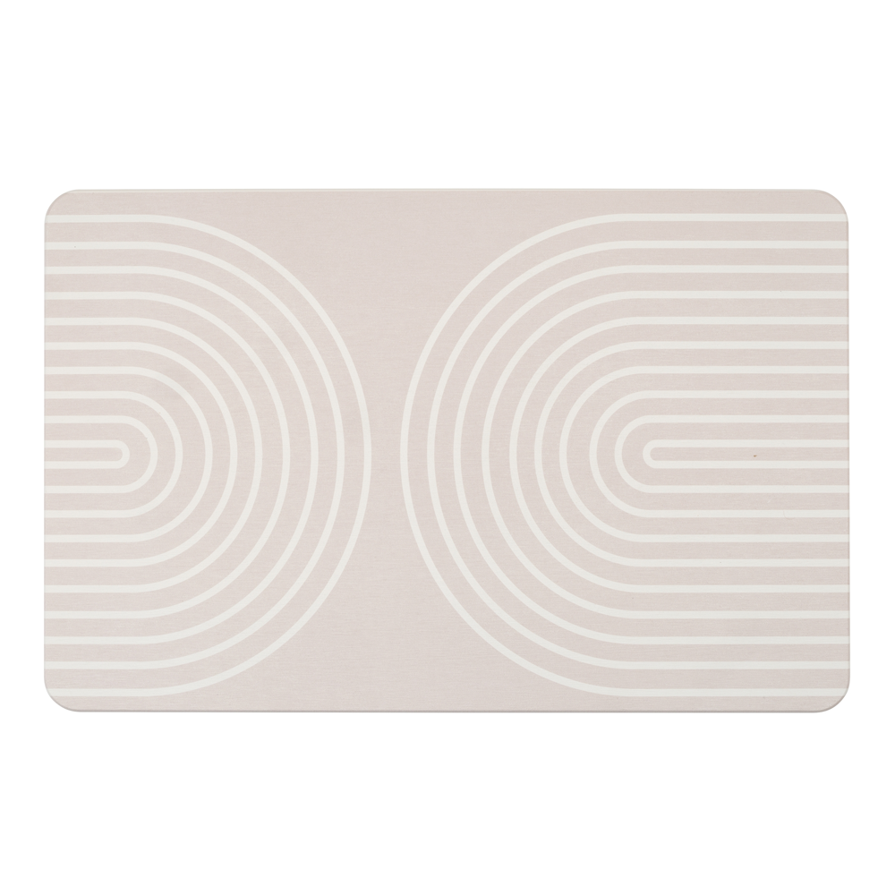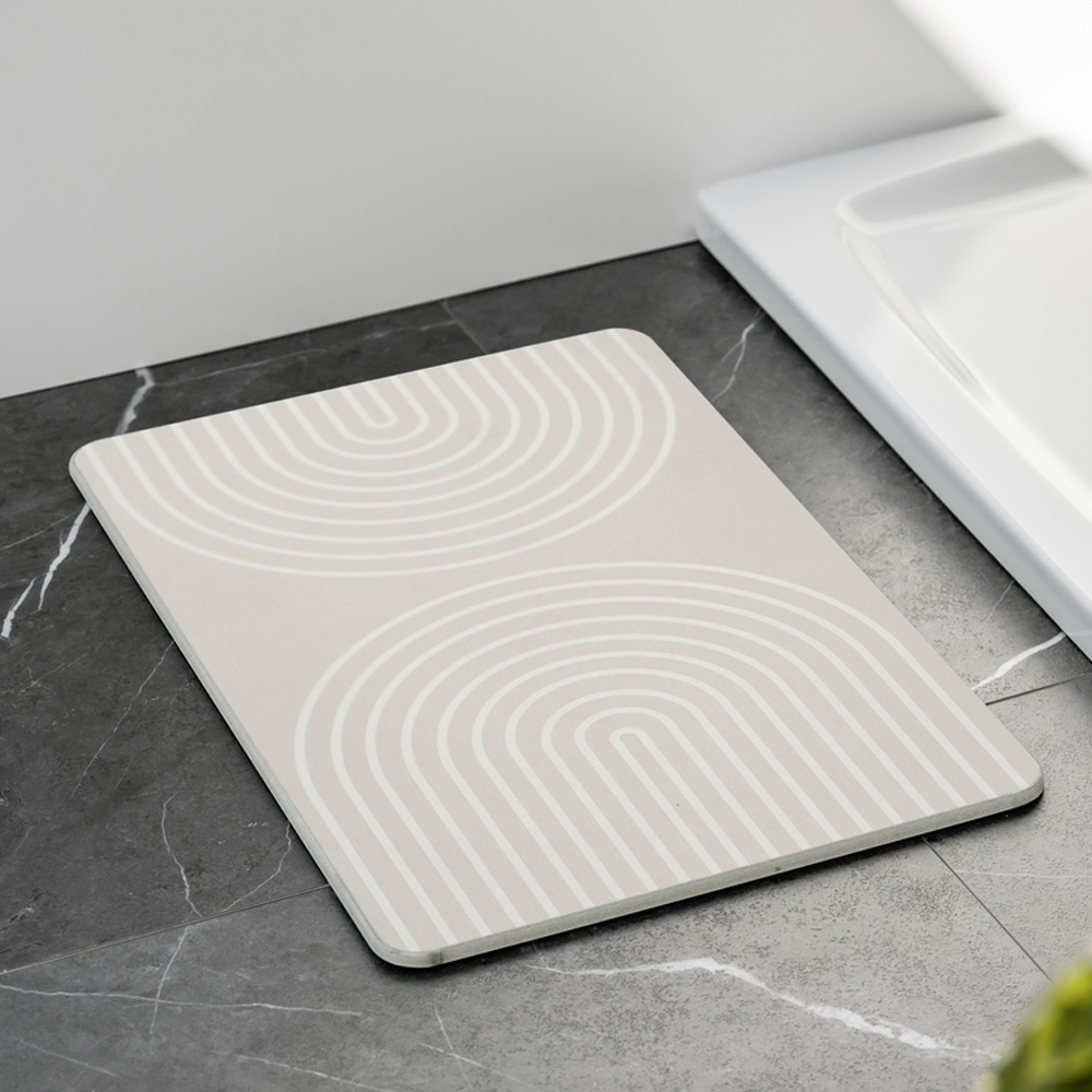 The decorative bath mat in grey with an abstract wave pattern is made of natural, durable diatomite (diatomaceous earth) with very high water-absorbing and quick-drying properties. Thanks to its diffusion properties, the diatomaceous earth used ensures that wet feet dry on the sturdy sheet in a matter of seconds. As if by magic, the moisture on the surface of the mat disappears in no time at all, preventing musty odours from developing in the first place.