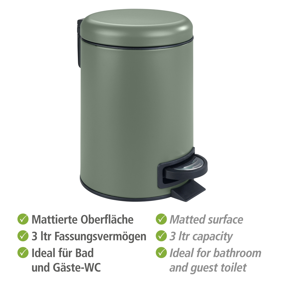 The elegant pedal bin from the Leman series by WENKO impresses with its appealing look and high-quality texture made of robust steel with a stylish dark green lacquer. Thanks to the integrated pedal function, the lid of the cosmetics bin can be conveniently opened without a handle and then closes again automatically, saving unnecessary bending during use. The removable insert made of black plastic with an integrated bag holder enables easy disposal of the contents and thorough cleaning of the bin. With its manageable dimensions of (WxHxD): 17x25x22.5 cm, the smart cosmetic bin also fits into smaller bathrooms or guest toilets and has a capacity of 3 litres. This means that the industrious helper can easily cope with the smaller waste that accumulates in the kitchen or office during the course of the day. Its stylish lacquered surface and classic shape are trendy and reflect a lifestyle and furnishing style that is very close to the spirit of the times.